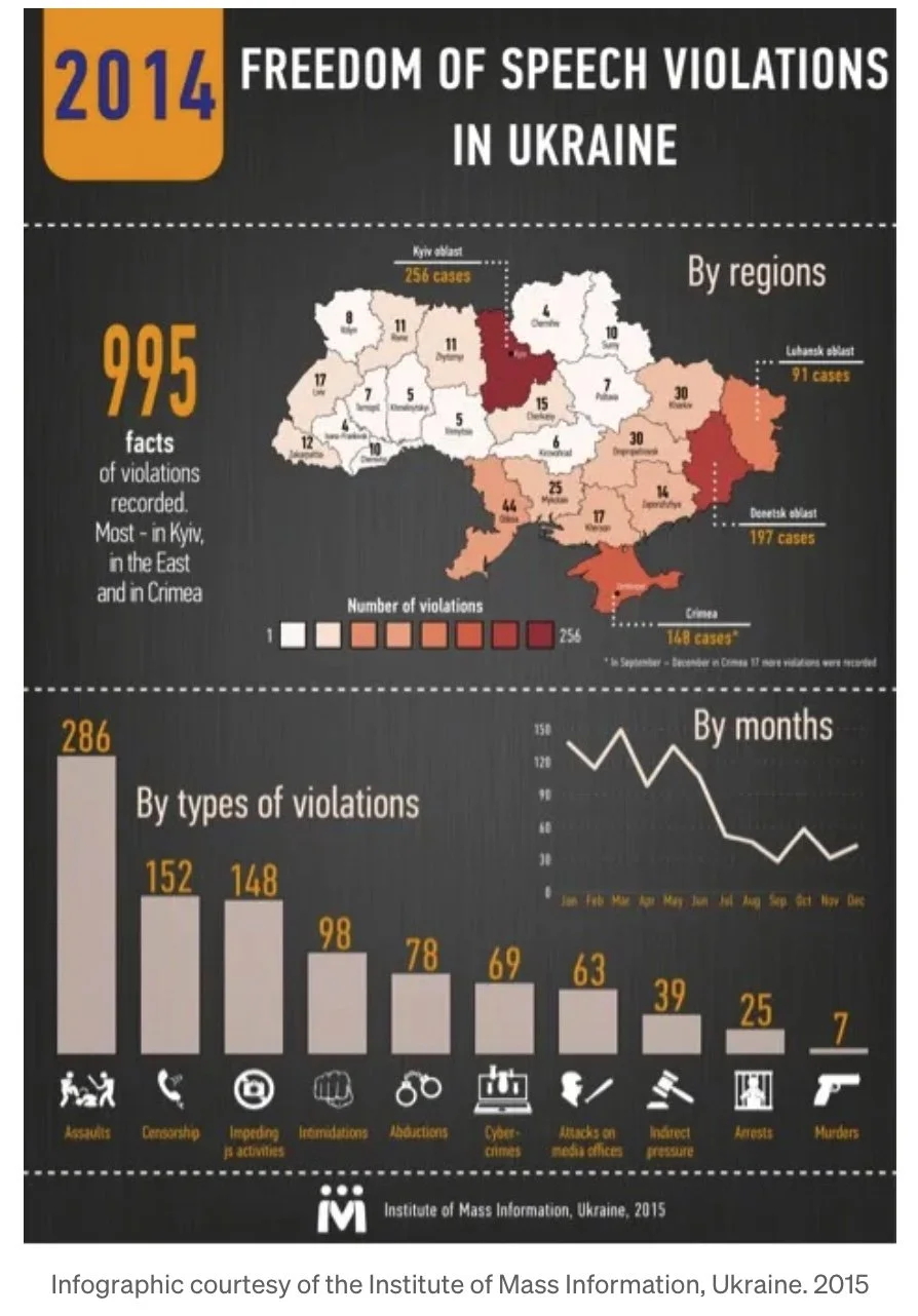 2014 was a particularly bad year for Journalists in Ukraine. Between the revolution on the Maidan in February of 2014 and the outbreak of conflict in the East in March, 2014 was one of the worst years on record, particularly for physical assaults with almost 1,000 violations according to the Ukrainian Institute of Mass Information. In fact, the total number of violations in 2014 was 995 cases – twice the number in 2013 (496 cases) and three times as many as in 2012 (324 cases).